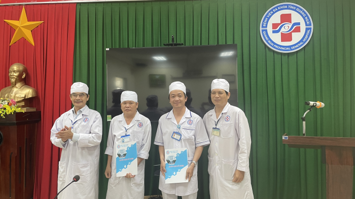 Trao Quyết định bổ nhiệm lại chức vụ Trưởng khoa CĐHA cho ông Lê Văn Hùng, Trưởng khoa GMHS cho ông Nguyễn Đình Tin; bổ nhiệm mới chức vụ Phó trưởng khoa ĐTTYC cho ông Lê Văn Hào, Phó trưởng khoa Ngoại CTCH-B cho ông Nguyễn Văn Hoàng
