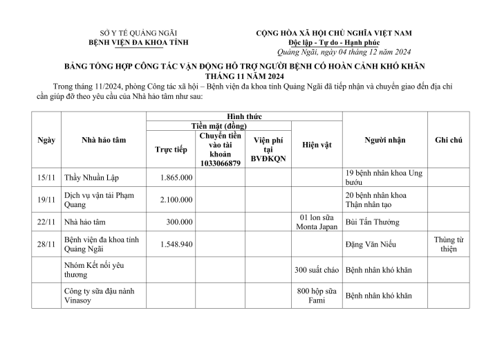 TỔNG HỢP CÔNG TÁC VẬN ĐỘNG HỖ TRỢ NGƯỜI BỆNH CÓ HOÀN CẢNH KHÓ KHĂN THÁNG 11/2024