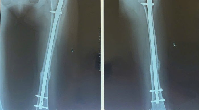 Thêm một trường hợp là bệnh nhân nữ P.L.P, 17 tuổi, sau 3 tháng được phẫu thuật bằng kỹ thuật đóng đinh nội tủy tại bệnh viện, vào ngày tái khám, ghi nhận bệnh nhân đã phục hồi tốt chức năng vận động so với trước, có thể đi lại mà không cần nạng và thực hiện được các sinh hoạt cá nhân cũng như công việc bình thường, kết quả chụp X-quang cho thấy xương đã liền tốt.