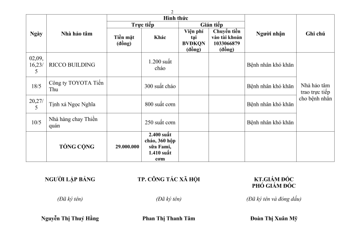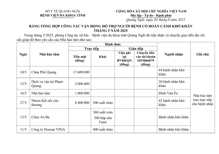 TỔNG HỢP CÔNG TÁC VẬN ĐỘNG HỖ TRỢ NGƯỜI BỆNH CÓ HOÀN CẢNH KHÓ KHĂN THÁNG 5/2025