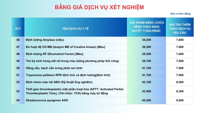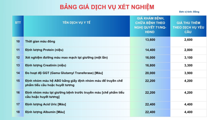 BẢNG GIÁ DỊCH VỤ XÉT NGHIỆM