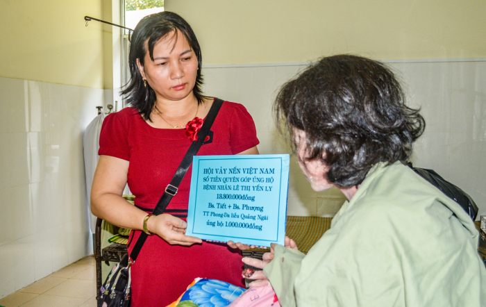 Tại đây, Bác sĩ Phạm Thị Tiết đã trao 14.300.000 đồng cho chị Ly (trong đó, Hội vảy nến Việt Nam ủng hộ 13.300.000 đồng; Bác sĩ Tiết và Bác sĩ Phượng - Trung tâm Phong Da liễu tỉnh ủng hộ1.000.000 đồng). Được biết, chị Ly không còn cha mẹ, phải sống chung với người cô ruột, có hoàn cảnh đặc biệt khó khăn. Hy vọng, phần quà trên có thể giúp chị Ly phần nào trang trải cho cuộc sống hằng ngày./.