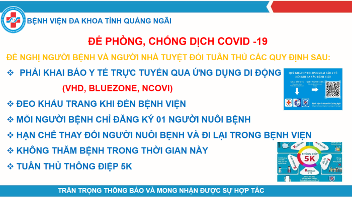 Trước những diễn biến phức tạp của dịch bệnh Covid-19, Bệnh viện đa khoa tỉnh Quảng Ngãi yêu cầu người bệnh và người nhà người bệnh khi đến bệnh viện phải thực hiện Khai báo y tế và Quét mã QR - Code. Theo đó, tất cả người dân đến Bệnh viện phải thực hiện Khai báo y tế và Quét mã QR - Code trên điện thoại thông minh. Để thuận tiện cho việc làm thủ tục nhanh chóng, người dân vui lòng tải ứng dụng Khai báo y tế và khai báo tại nhà,