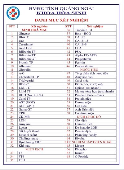 Danh mục xét nghiệm khoa hóa sinh đang thực hiện